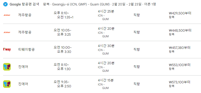가장 저렴한 항공편은 제주항공 7C3106편으로, 2024년 2월 20일 오후 8시 10분에 김포국제공항에서 출발하여 2024년 2월 21일 오전 1시 35분에 괌에 도착합니다. 비행 시간은 약 4시간 25분이며, 편도 요금은 429,500원입니다.