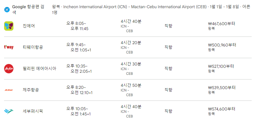 - 인천국제공항에서 세부 막탄국제공항으로 출발 (약 4시간 40분 소요)